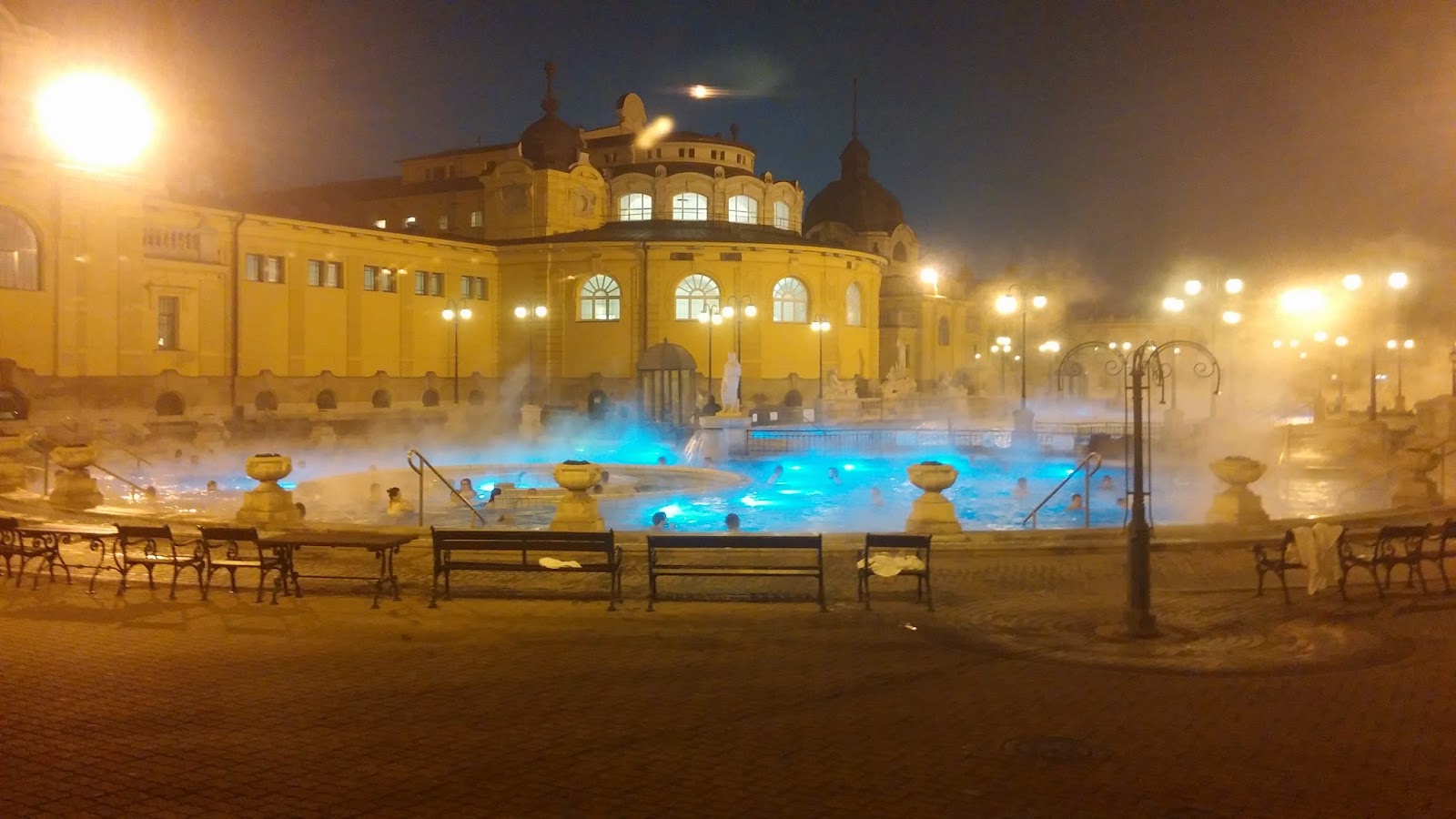 Det er noen andre attraksjoner jeg anbefaler på pest-siden. Fra Vorsmartyplassen kan man ta metroen (den gule linjen) til stoppet Hősök tere, når man da kommer ut er man ved Helteplassen. En stor åpen plass med fler statuer, blant annet Milleniumsmerket og flere mindre statuer av Ungarns helter. Fra Helteplassen kan man gå over til byparken, der jeg blant annet anbefaler lunsj eller middag på restauranten Robinson (flyter på vannet i starten av parken). På venstre siden av parken finner man Budapest zoo, som jeg anbefaler hvis man har ca. en halv dag ledig. Masse å se, så her tar det tid før du kommer deg ut igjen. Det jeg synes var verst var å komme inn i et mørkt rom der taket var dekket med flaggermus, men de har litt mindre skumle dyr også 😉 Området med Budapest zoo og Helteplassen ligger ved siden av en stor park, byparken. I enden av byparken finner man Szechenyi badet. Jeg har lest om de populære badene i Budapest ved flere anledninger, men prøvde de ikke før denne siste turen. Dette var en av de mest spesielle og absolutt beste øyeblikkene på alle mine turer til Budapest, og jeg er glad jeg fikk oppleve det på vinteren. Jeg er ikke spesielt glad i kulde, så å bade ute om vinteren var noe jeg aldri trodde jeg ville oppleve. Leste på forhånd at noen anbefalte to håndduker, og det er jeg glad jeg fikk med meg. Jeg hadde en håndduk rundt meg når jeg gikk mellom de ulike badene, spesielt utenifra og inn, denne håndduken ble våt og kald etter hvert. Da var det veldig godt å ha en tørr håndduk ventende i garderoben når man var ferdig. Det andre jeg selv anbefaler på vinteren er sandaler. Det var veldig ubehagelig å gå barfot på iskalde steinheller, spesielt når beina var våte etter et bad. En gang skal jeg prøve slike bad på sommeren også, men jeg tror at det som gjorde opplevelsen magisk var temperaturen, stemningen og når dagslyset sakte forsvant og dampen/tåka vistes ordentlig.